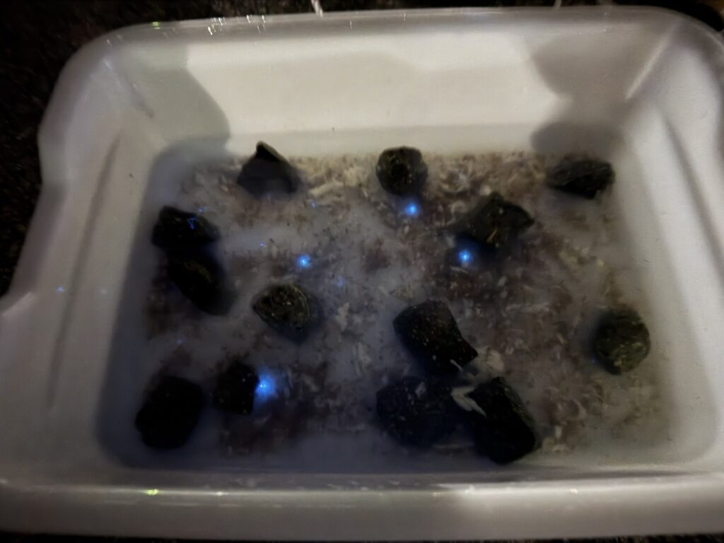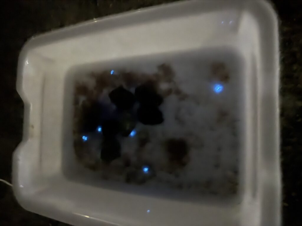 夕食を食べる前にウミホタルの仕掛けを海に落としました。暗くなって仕掛けを引き上げると、青く光るウミホタルがたくさん採れていました。白いバットの中で刺激を与えるときれいに光る様子が観察できました。